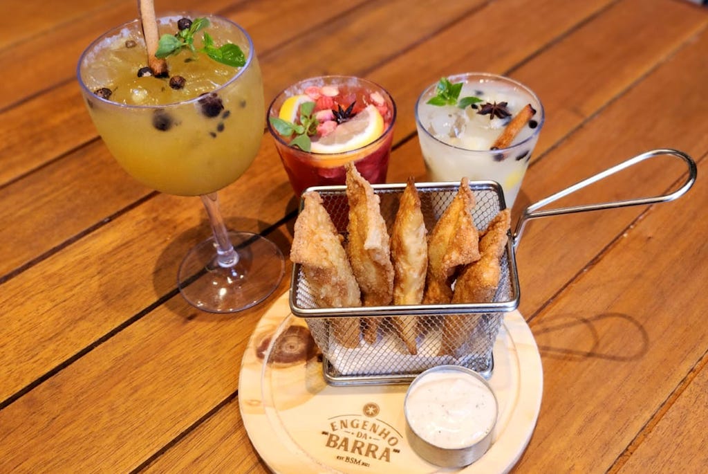 A codorna, tão tradicional no alho e óleo, virou recheio de coxinha com catupiry e páprica defumada, empanada na farinha panko, e vem acompanhada de aioli de cenoura. Os drinques merecem toda atenção. O Flor do Agreste é gin da casa infusionado com mel da Palatéia (comunidade da Barra de São Miguel), misturados com tônica e maracujá. Já a caipirinha de pinha com a cachaça do próprio engenho também tem o tom acentuado alagoano.