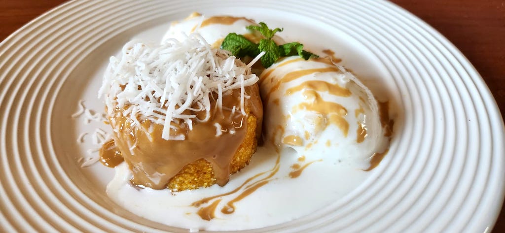 Gateau do engenho é bolinho de milho recheado e coberto com doce de leite. Acompanha duas bolas de sorvete de coco. A banana é flambada na cachaça Barona prata e ganham sorvete de banana e caramelo salgado. Os sorvetes são da Sorveteria da Praça da cidade de Coruripe.