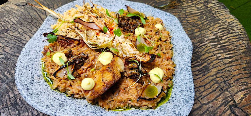 Sururuba do Mar: arroz no caldo de polvo e de camarão, farofa de coco, emulsão de limão, camarão, sururu, peixe e óleo de coentro
