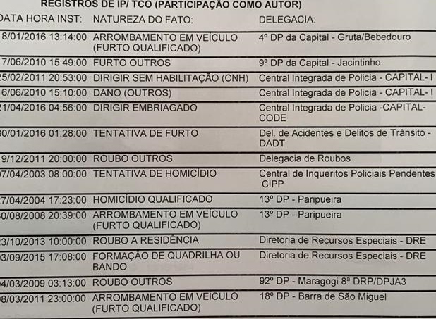 Na extensa ficha criminal de Glimberg constam delitos cometidos desde 2010, em diversas regiões alagoanas, incluindo litoral e Capital. Ele conduzia um Fiat Palio prata quando foi abordado pela guarnição policial.