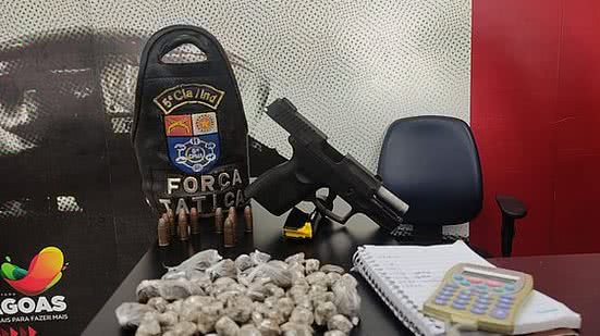O suspeito foi encontrado durante patrulhamento dos militares e estava com uma pistola de 9 mm na cintura, com seis munições intactas, e uma pochete contendo 70 bombinhas de maconha. Além da arma e da droga, os agentes flagraram uma caderneta com anotações de dívidas do tráfico e uma calculadora com o criminoso.