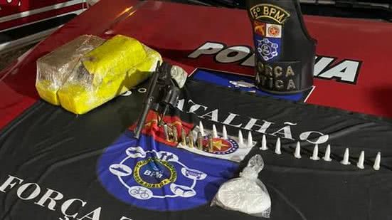 Após deslocamento da equipe, o suspeito foi abordado e guardava um revólver de calibre 38, com seis munições. Ao fazer a busca veicular, a polícia encontrou 1,92 kg de maconha e 52 g de cocaína.