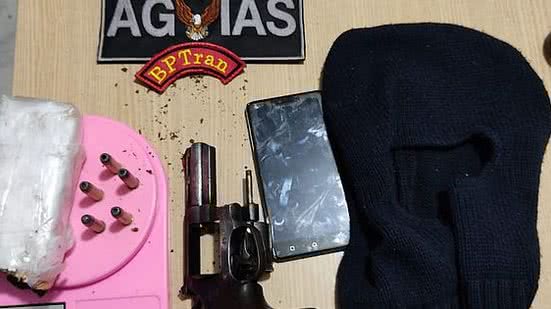 Após ser questionado pelos agentes, ele indicou onde estava o material ilícito, que foi encontrado dentro de uma sacola. Um revólver de calibre 38 com cinco munições intactas, 260 g de maconha, uma balança de precisão e uma balaclava foram apreendidos.