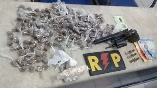 Michael Mendes da Silva, vulgo “Quebrada”, de 21 anos, foi encontrado com 350 gramas de maconha, 62 pedrinhas de crack, um revólver calibre 38, com numeração suprimida e seis munições intactas, uma balança de precisão, e uma quantia em dinheiro especificada em R$ 30.