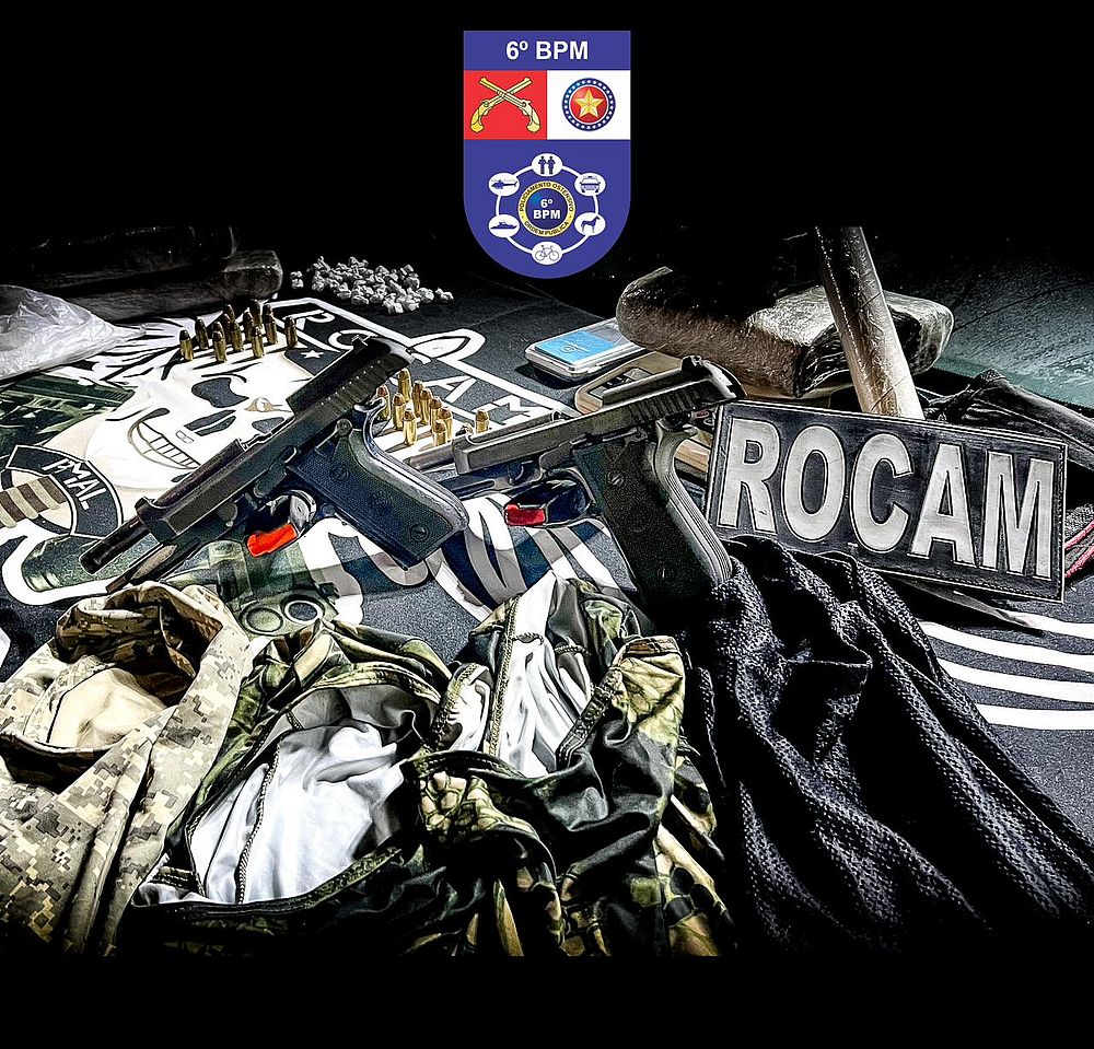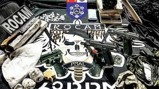 Duas pistolas de calibre 40, sendo uma delas com brasão da Polícia Militar de Alagoas e a outra da Secretaria de Segurança Pública do Ceará, foram recolhidas com o suspeito. Dois carregadores e 24 munições também foram encontrados na mochila dele. Uma faca peixeira também foi apreendida.