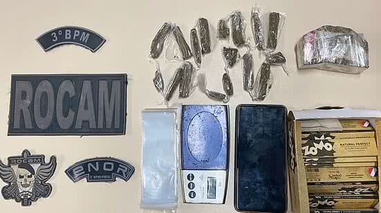 Ao todo, foram recolhidos uma barra de maconha, 17 bombinhas da mesma droga, um celular, uma balança de precisão e embalagens para armazenar o produto ilícito.