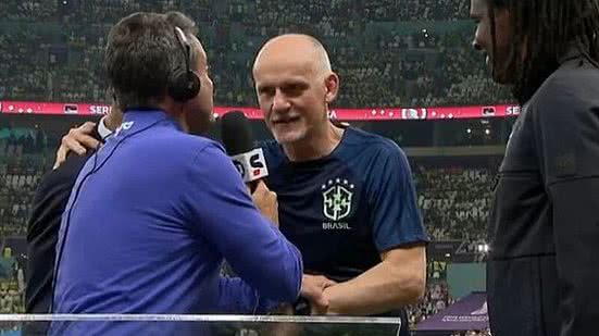 Eric Faria conversava com Cafu quando Taffarel apareceu na imagem e abraçou Roque Jr. O repórter, então, falou com o preparador de goleiros da Seleção Brasileira e pediu para que ele completasse o bordão eternizado por Galvão Bueno. O ex-goleiro respondeu.