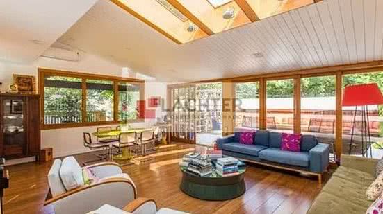 Com dois andares, a casa tem, segundo a imobiliária, 4 suítes e 6 banheiros, além de vista para o Cristo Redentor. No primeiro andar, ficam o hall de entrada, o pátio interno, dois lavabos e a sala de estar que se comunica com a ampla cozinha.