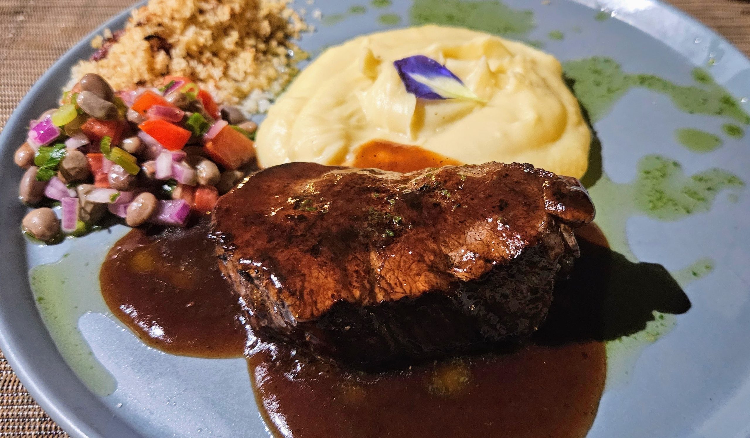 Espetáculo é o tradicional bobó de camarão ganhar texturas de abóbora, no vinagrete, no arroz e no próprio camarão com coco. Já Surf Turf é a mistura de terra e mar com filé e camarões grelhados na manteiga de garrafa com purê de batata doce, vinagrete de feijão verde e farofa de cebola queimada.