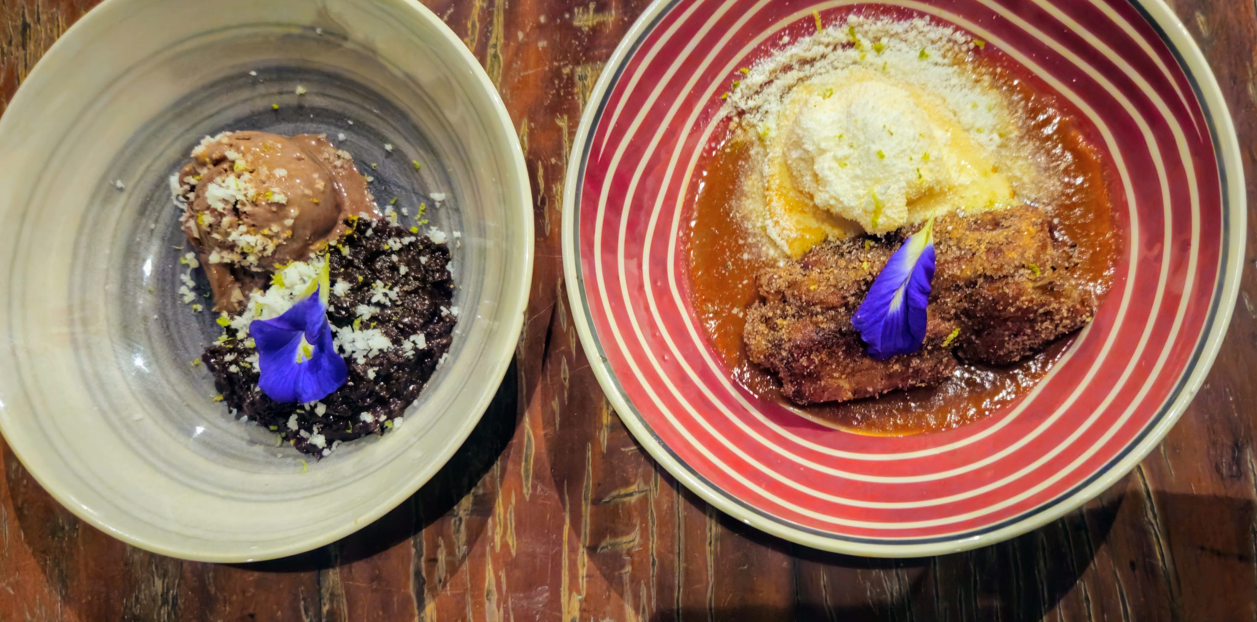 Para adoçar a vida tem dois clássicos: Fatia Parida – com toffe de coalhada, sorvete, pó de chocolate branco e cítricos. O prestigio é a cocada mole de chocolate com sorvete de chocolate e coco fresco.