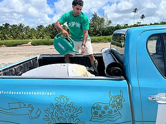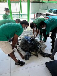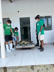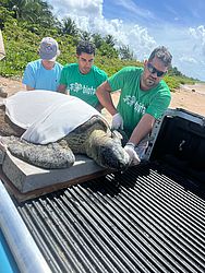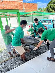 De acordo com informações do Instituto Biota de Conservação, o animal, uma fêmea de 131 quilos, foi encontrado encalhado na faixa de areia da praia. A espécie está ameaçada de extinção e o nome tartaruga-verde deve-se à coloração esverdeada da sua gordura corporal.
