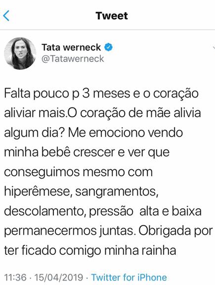 No Twitter, a apresentadora do Lady Night falou sobre esse amor materno. "Falta pouco para três meses e o coração aliviar mais. O coração de mãe alivia algum dia? Me emociono vendo minha bebê crescer e ver que conseguimos mesmo com hiperêmese, sangramentos, deslocamento, pressão alta e baixa, permanecemos juntas. Obrigado por ter ficado comigo, minha rainha", declarou.