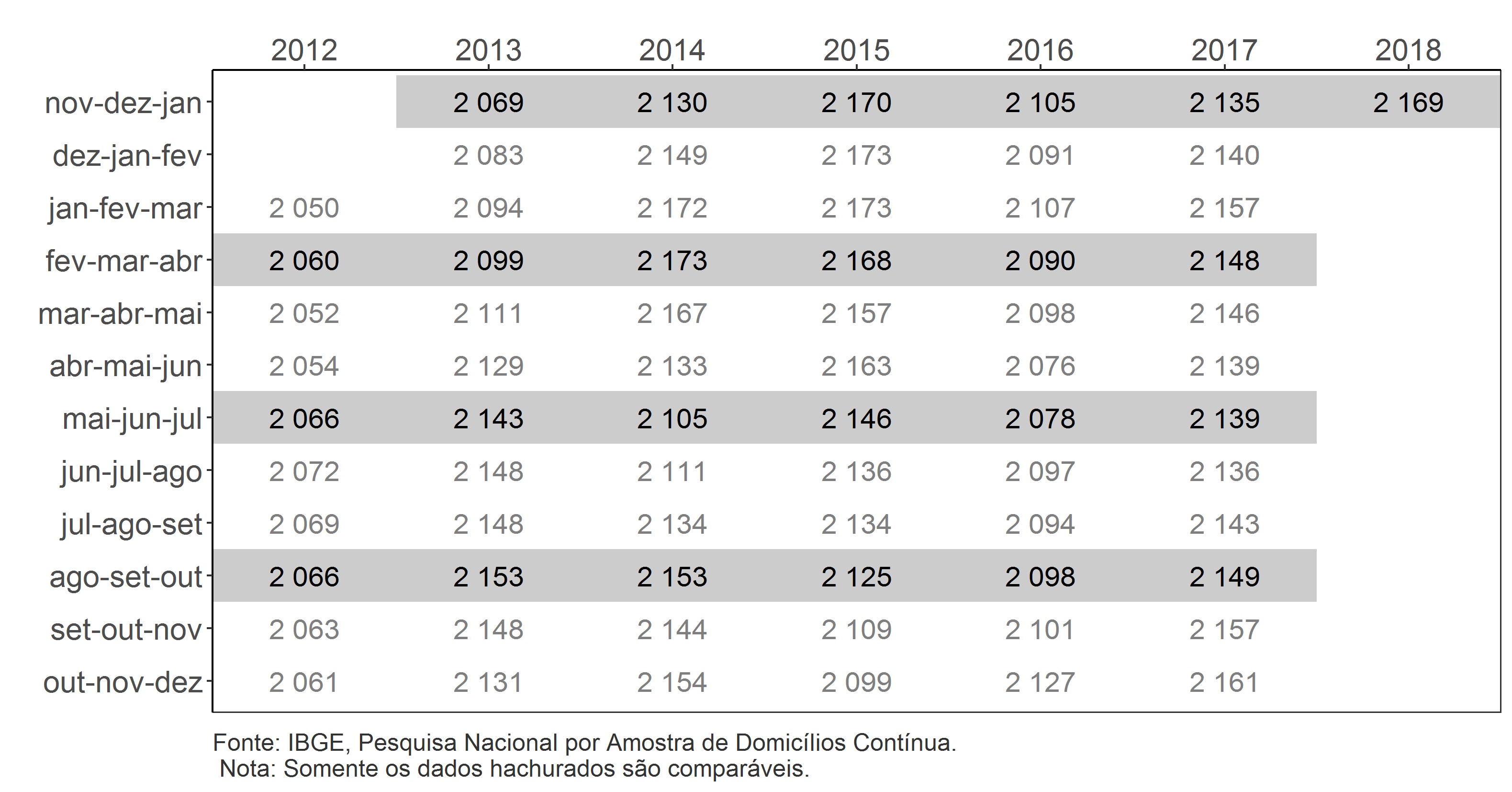 Indicador / Período | Nov/17 - dez/17- jan/2018 | Ago-set-out 2017 | Nov/16 - dez/16- jan/2017 |