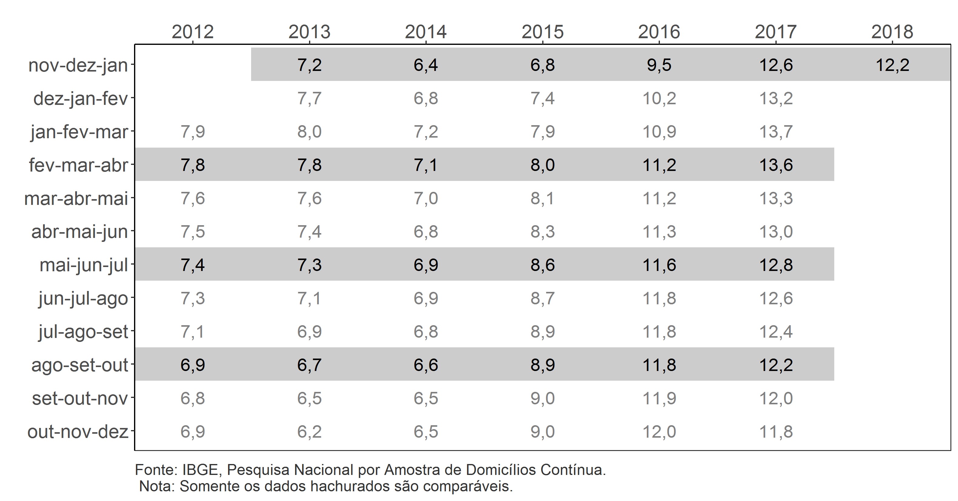 A taxa de desocupação (12,2%) no trimestre de novembro de 2017 a janeiro de 2018 registrou estabilidade em relação ao trimestre de agosto a outubro de 2017 (12,2%).