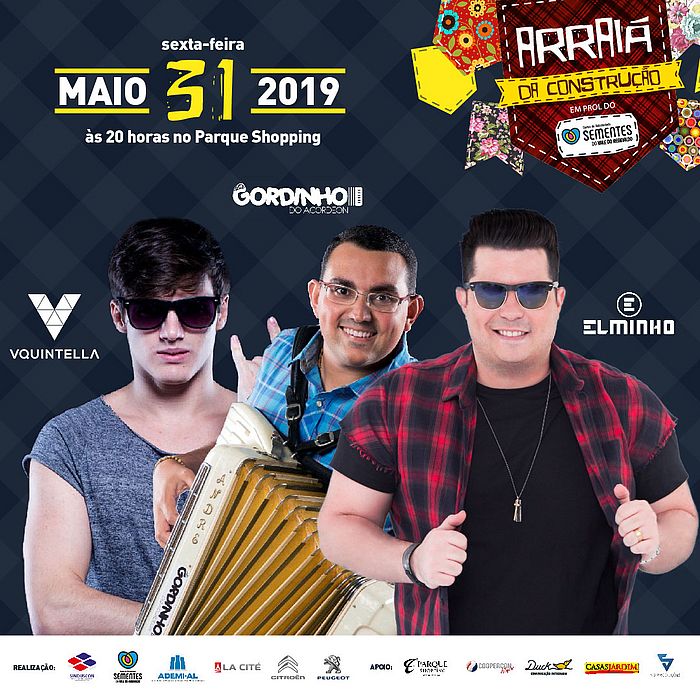Arraiá da Construção com o cantor Elminho, Gordinho do Acordeon e o Dj Victor Quintella. A renda da festa beneficente será revertida para a reforma da nova sede do Centro de Voluntariado Sementes do Vale, localizado na Igreja dos Capuchinhos, que atende mais de 70 jovens do Vale do Reginaldo. Além de muita comida típica, vendida nas barraquinhas do evento, os jovens do Sementes apresentarão uma quadrilha para animar o público.