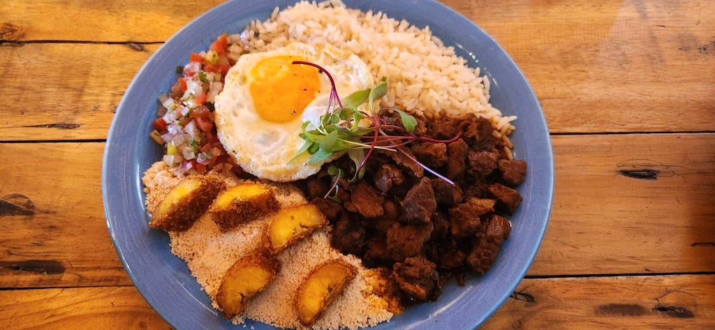 Quem está fazendo sucesso é o picadinho: cubos de carne com banana empanada, arroz, farofa crocante, vinagrete e ovo da gema mole.