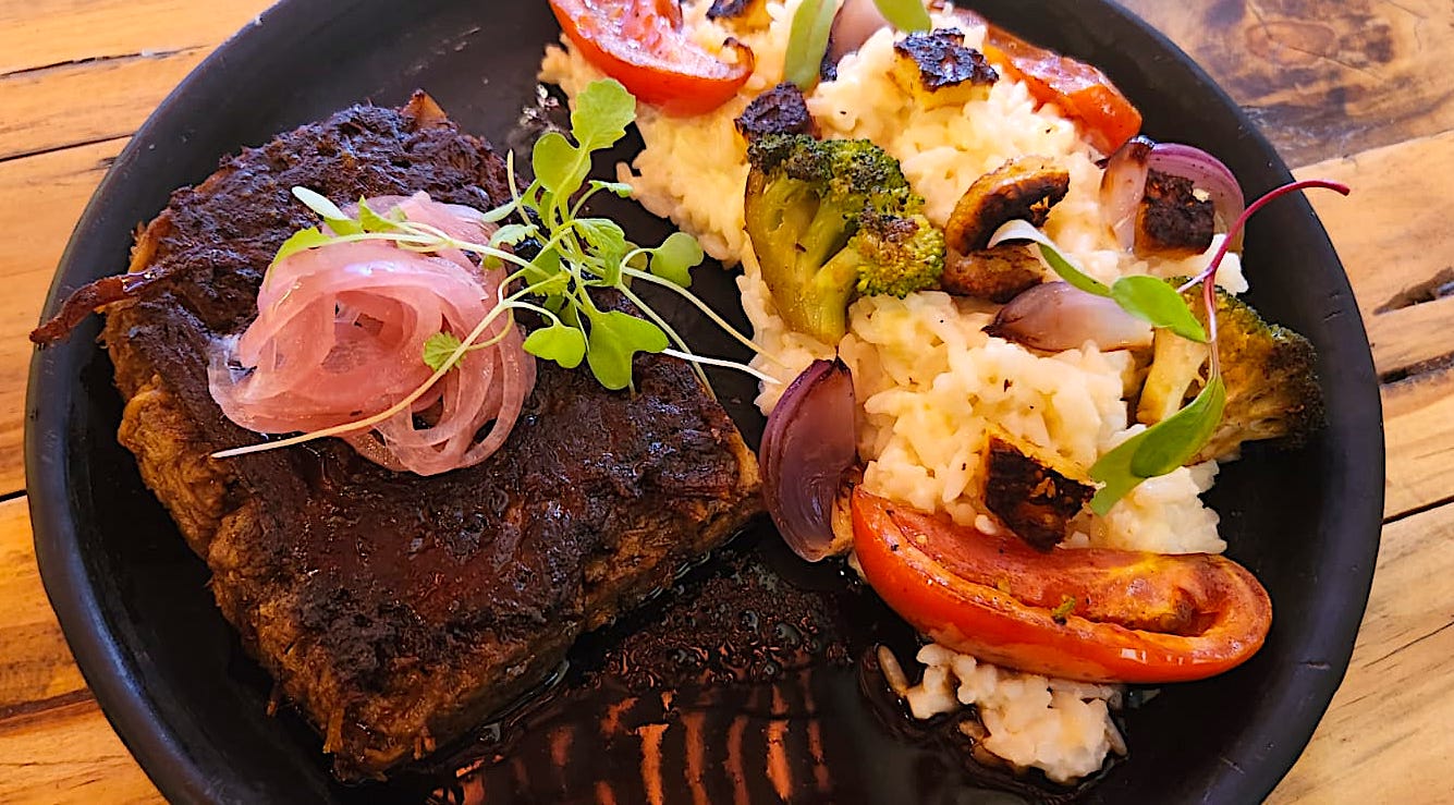 Costela prensada com legumes tostados e arroz de leite com queijo coalho