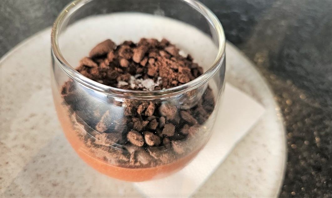 Mousse de chocolate meio amargo, doce de leite, farofa de Negresco e flor de sal