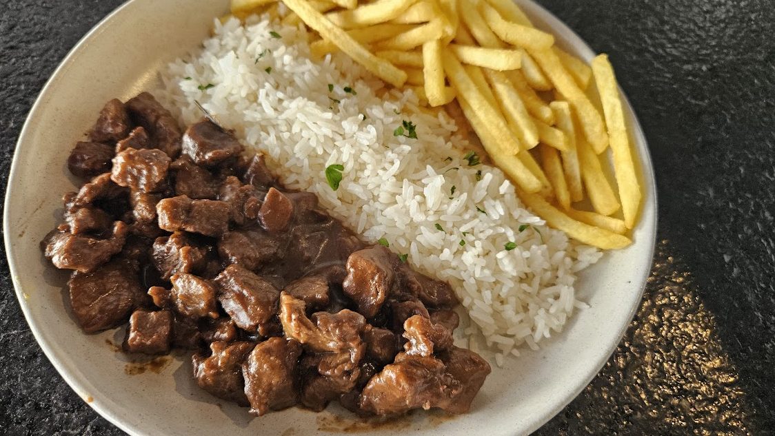 Picadinho de filé ao molho de cerveja preta, acompanhado de arroz branco com salsinha e batatas fritas.