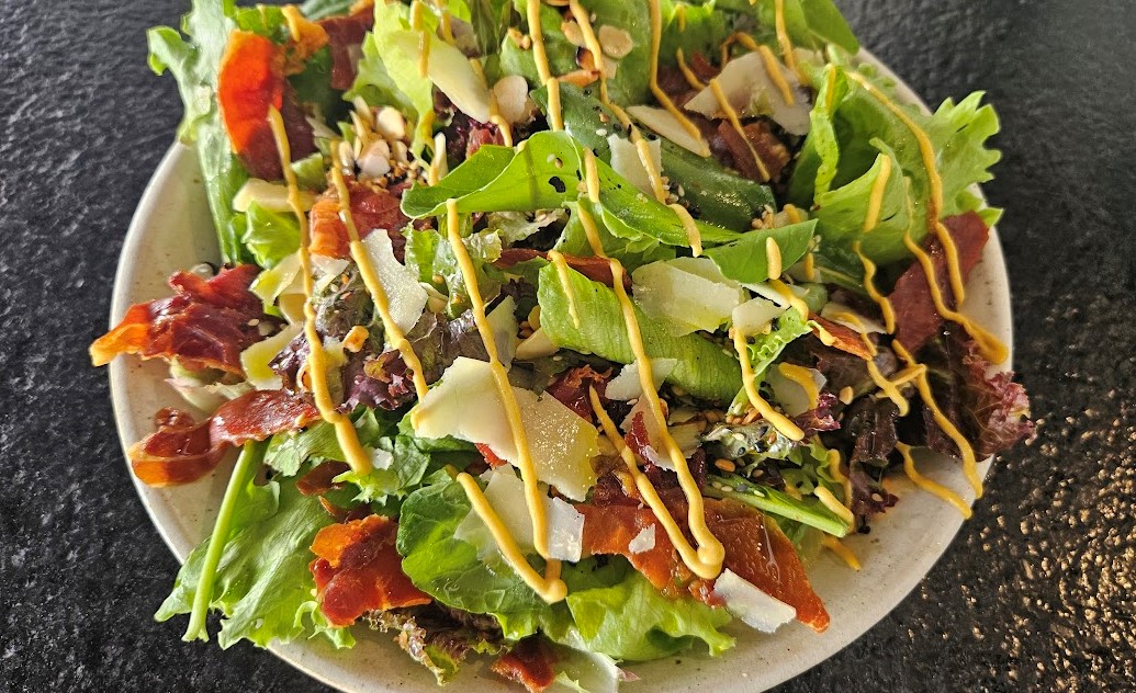 Salada: mix de folhas, Grana Padano, chips de parma, uvas confitadas e molho de mostarda: