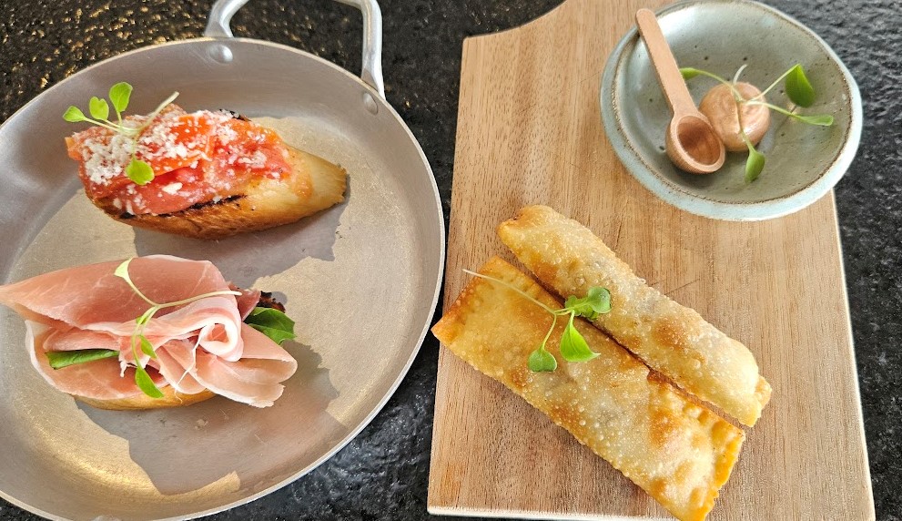 Dupla de mini bruschettas — um pãozinho com tomate e manjericão, outro com presunto de parma e rúcula — ou o pastel de brie com cebola caramelizada