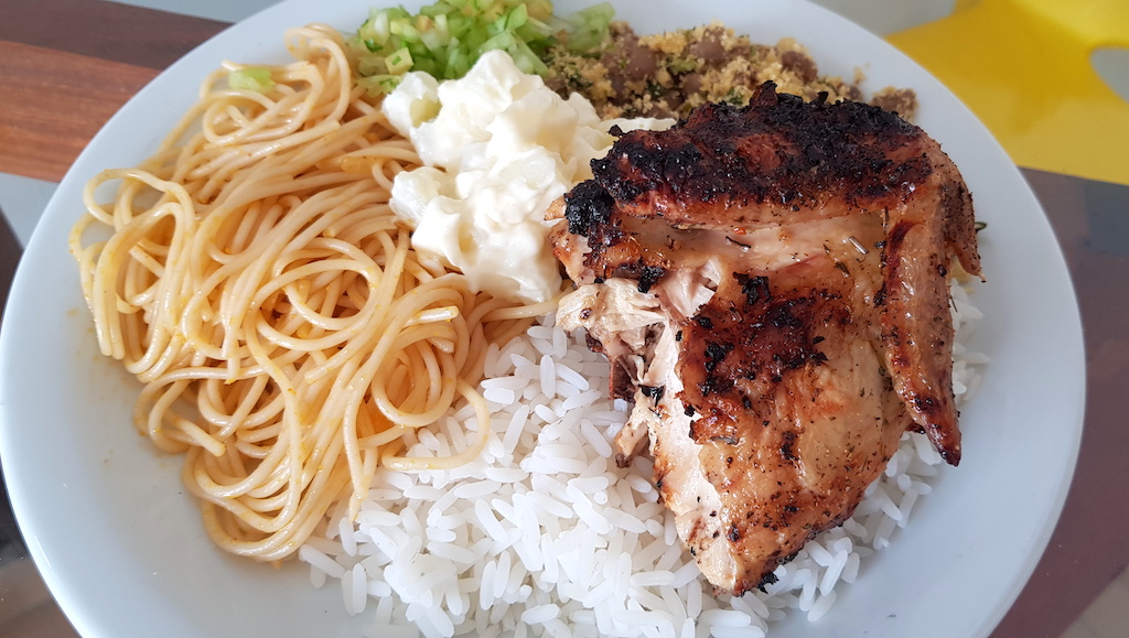 O galetinho também leva “o Segredo de Estado” do chef, além do sal parrilla. A ave é assada 45 cm de distância do fogo, e o freguês escolhe na opção PF a coxa com entre coxa ou peito de frango.E vem escoltado pelo feijão verde, arroz e batata frita. Já nas sextas tem feijoada com calabresa defumada e charque, na companhia do arroz, farofa e couve. O feijão é bem encorpado e saboroso.