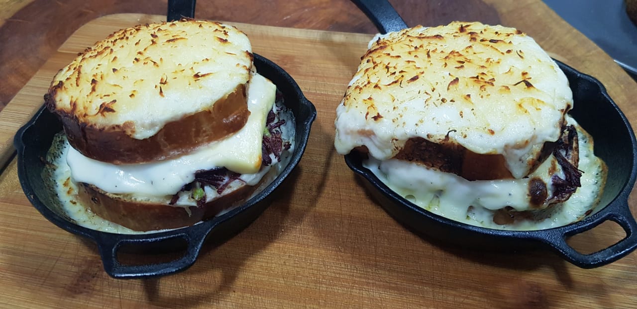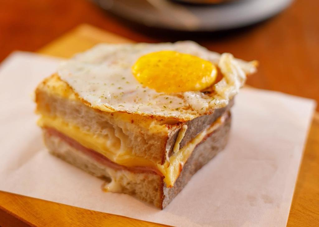 Croque Madame com queijo, presunto, ovo, e molho bechamel gratinado