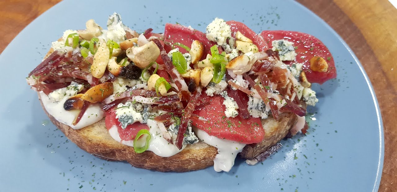 Tartine de goiaba em pétalas com gorgonzola, copa lombo e castanha no pão italiano de fermentação natura