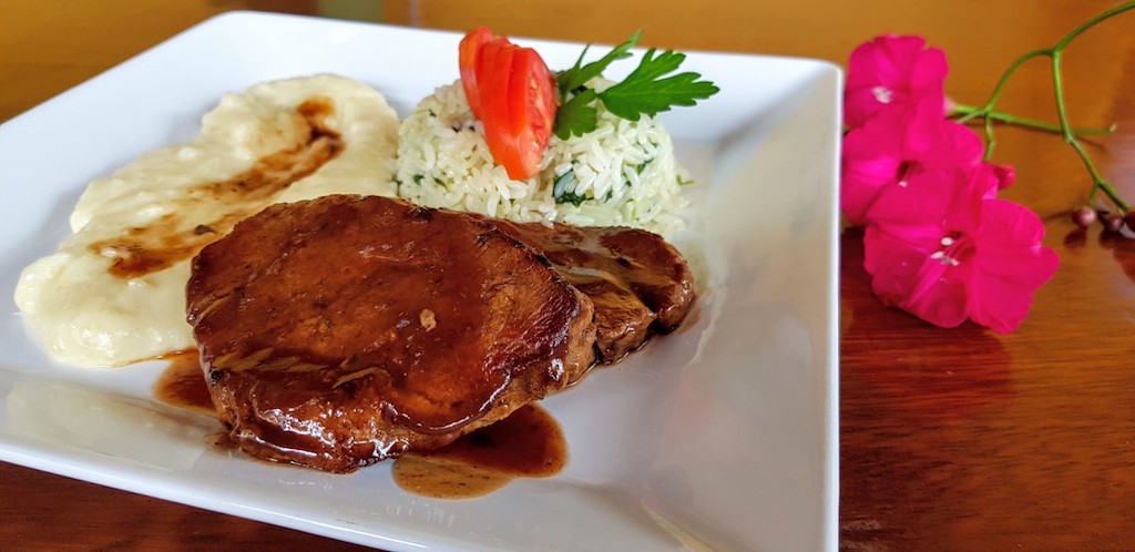 Filé ao molho de vinho com purê de macaxeira e arroz de brócolis