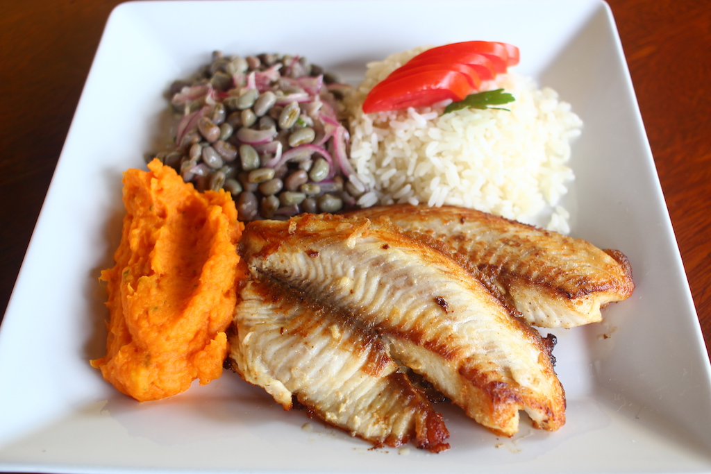Filé de tilápia com salada de feijão verde e purê de abóbora,