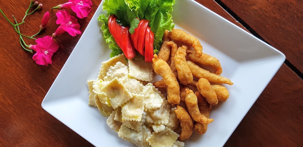 Raviolli de abóbora com gorgonzola e creme de ricota, e para acompanhar camarão à grega. A boa mistura da cozinha do mar, onde o crustáceo é empanado com a receita italiana de massa caseira é danada de boa. Basta regar com azeite.vPara quem deseja fugir dos pescados, tem filé de carne ao molho de vinho tinto, arroz de espinafre com purê de macaxeira.
