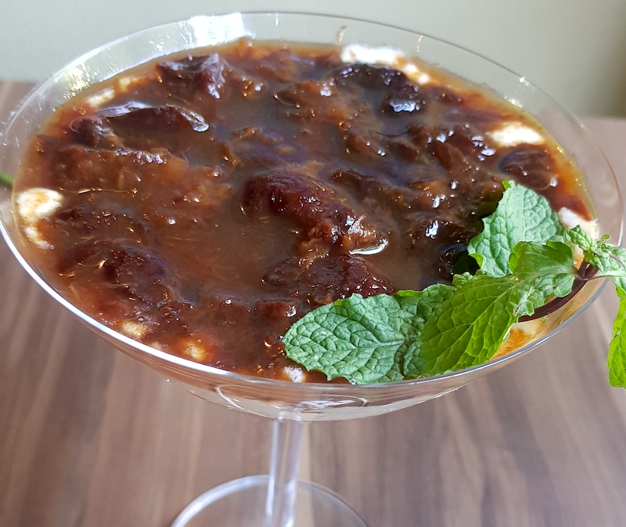 Na taça – Eu não sou fã do doce Olho de Sogra, mas a chef Thaísa resolveu dar uma mexida na ordem. Ela fez um mousse de ameixa, creme de coco e calda de ameixa. Amei tanto, que gulosamente, comi todo o doce lindamente servido na taça.