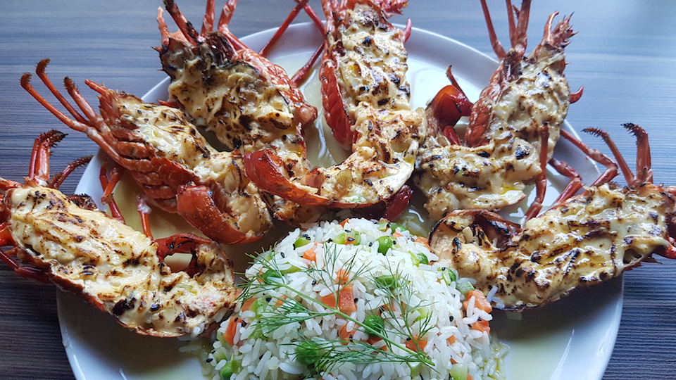 Lagosta Santorini – O bichinho do mar vem regado no molho de conhaque e gratinado com queijo prima Donna. Para acompanhar, arroz de legumes e toque de gergelim.