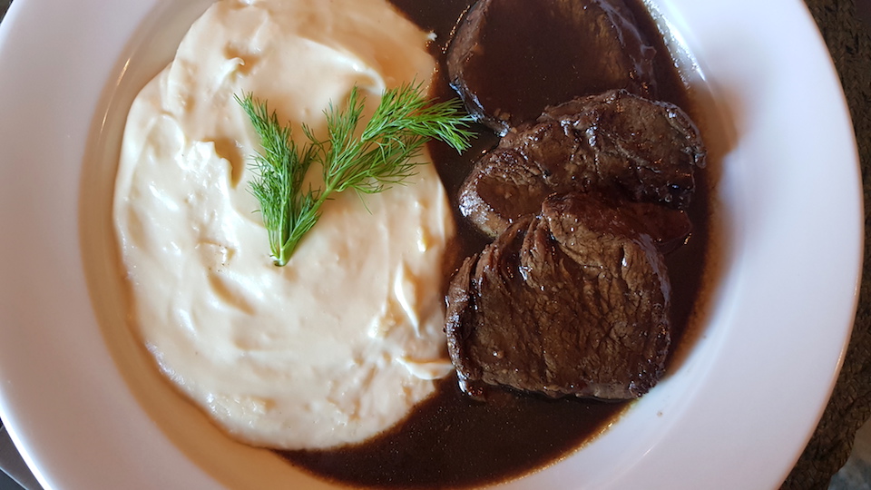 Além das lagostas – A chef Thaísa também manda bem com carnes. Um bom exemplo é o filé ao molho de café e vinho. A carne é servida com purê de batata inglesa com toque de queijo gruyere. E acreditem, o café e carne combinam muito bem. O sabor fica mais forte.