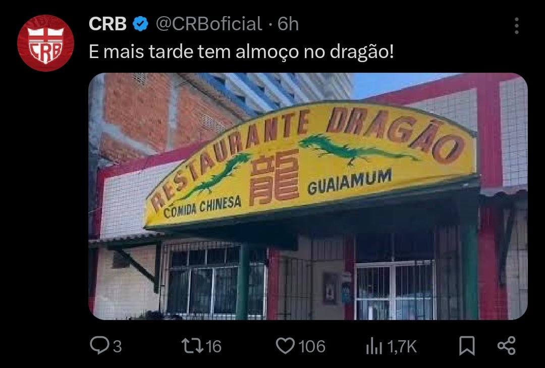 Em seguida, brincou que o almoço na quinta-feira (21) será no Restaurante Dragão, na capital alagoana. A postagem foi uma nova referência a eliminação, já que Dragão é o mascote da equipe sergipana. Veja:
