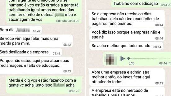 Com as restrições no grupo de WhatsApp, o funcionário do RH passou a receber mensagens dos trabalhadores em particular. Em uma dessas conversas, o representante do setor de Recursos Humanos da terceirizada ameaçou demitir uma funcionária se ela continuasse reclamando.