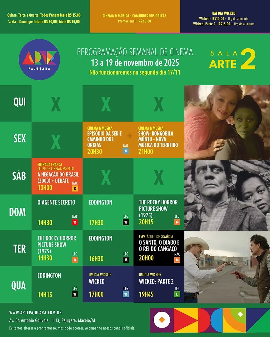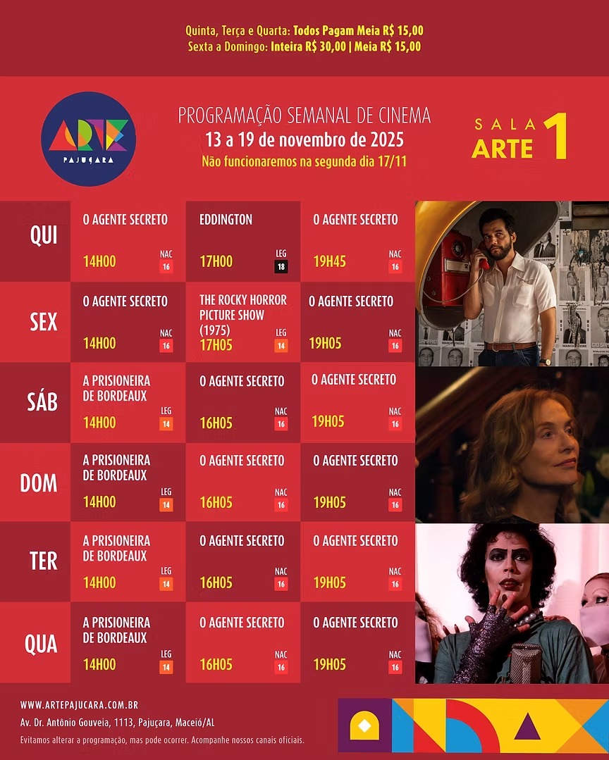 Para conferir a programação completa de todos os filmes em cartaz no Arapiraca Partage Shopping, Centerplex (Shopping Pátio Maceió), Cinesystem (Parque Shopping) e Kinoplex (Maceió Shopping): basta clicar aqui. Já para o Shopping da Vila, em Delmiro Gouveia, pode ser conferida aqui.