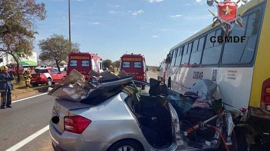Um carro bateu na traseira de um ônibus da Viação Pioneira na BR-040, altura do Centro de Instrução e Adestramento de Brasília (CIAB), neste sábado (15/7). Com o acidente, o teto do carro foi arrancado e os quatro passageiros, que eram idosos, foram levados para o hospital.