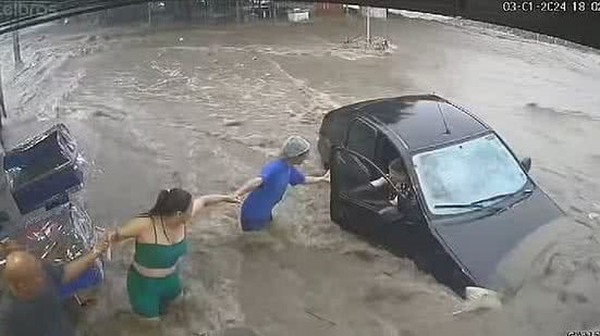 A criança de 8 anos desce do carro primeiro, mas é arrastada pela enxurrada. Dois adultos que tentam ajudá-la também são levados.