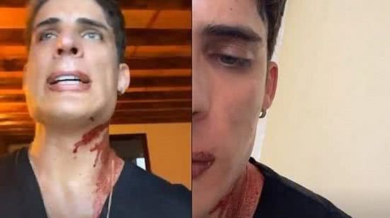 Tiago mostrou o rosto com machucados, a mandíbula e a boca inchadas, e bastante sangue na região da nuca. Um tanto desorientado, o modelo contou sobre o ocorrido dando a entender que apanhou de dois homens e um terceiro o atingiu com uma faca nas costas.