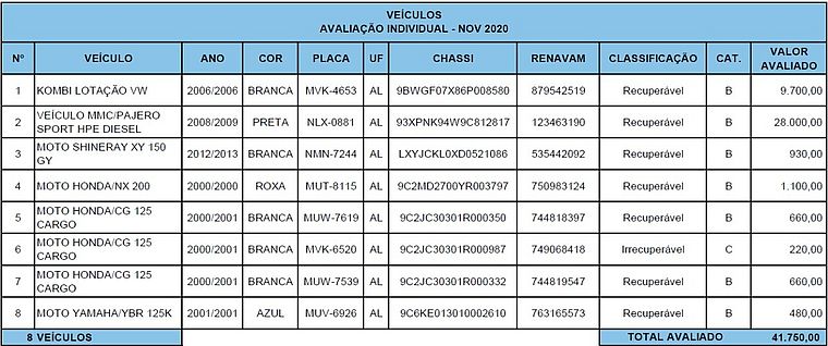 As fotografias individuais dos veículos e de cada categoria dos bens móveis em geral, bem como sua relação completa, estarão disponíveis no endereço eletrônico www.albuquerquelins.com.br do leiloeiro oficial Fernando Gustavo Alencar de Albuquerque Lins e no site www.tjal.jus.br do TJAL.