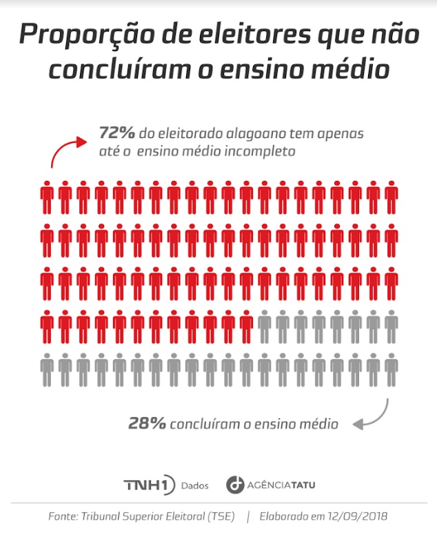 A soma dos eleitores alagoanos com ensino médio e ensino superior - completo ou incompleto - representa aproximadamente 28% do total. Um feito para apenas 3 em cada 10 eleitores no estado.
