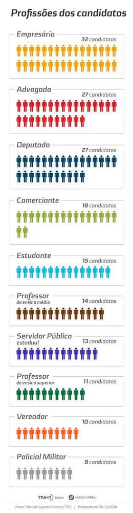 Ainda segundo os dados do TSE, as profissões mais comuns entre os homens são empresário e deputado, com 26 candidatos cada uma, e advogado, com 17 concorrentes.