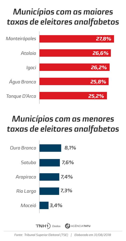 Em segundo lugar, vem o município de Atalaia, que conta com 26,5% dos eleitores analfabetos, seguido de Igaci, localizado no agreste de Alagoas, com 26,2%. Nas seguintes posições estão Água Branca e Tanque D’arca, com 25,8% e 25,2%, respectivamente. Maceió é o município com o menor índice de eleitores analfabetos do estado.