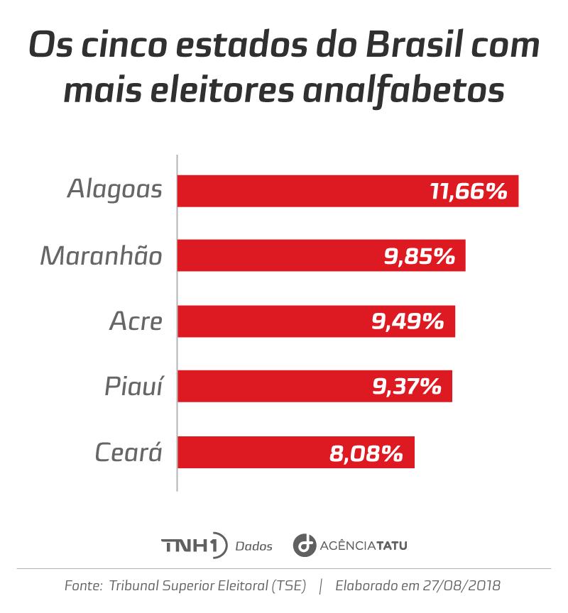Alagoas também figura na primeira colocação quando se trata de eleitores analfabetos entre os estados brasileiros, com 11,66%, sendo seguido pelo Maranhão, com 9,85%, e Acre, com 9,49%.