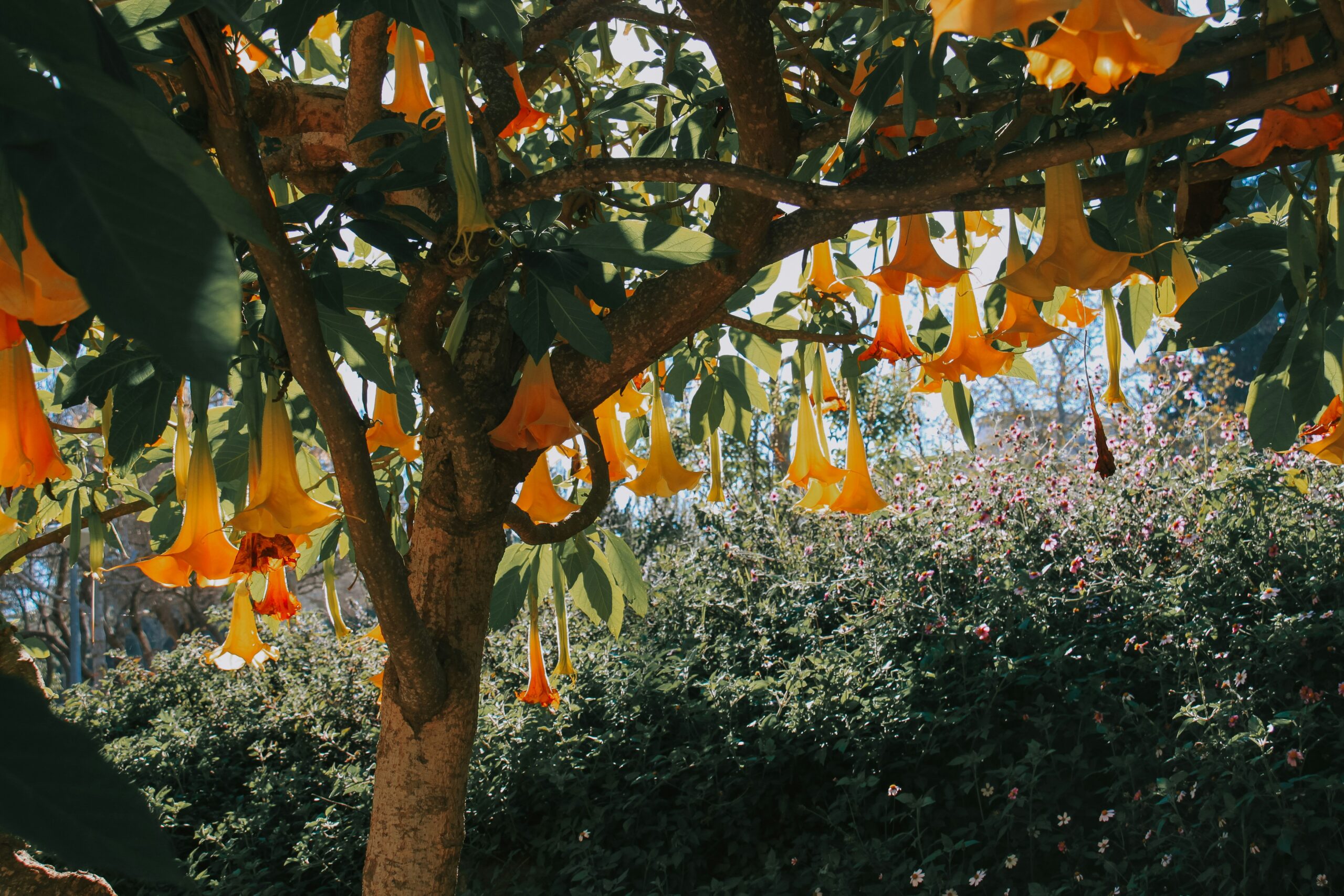 Trombeteira ou trombeta-de-anjo (Brugmansia suaveolens) – essa é uma das plantas mais bonitas dessa lista, com suas folhas grandes e flores pendentes, com coloração branca ou amarela, possui substâncias tóxicas e que causam alucinações.