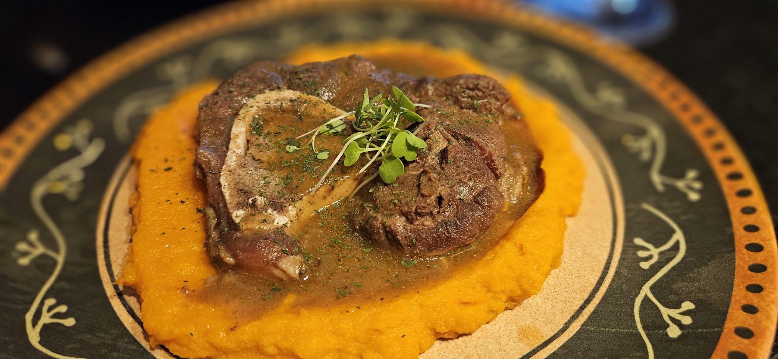 Outra estrela da casa é o ossobuco, e mais um purê danado de bom, o de abóbora, finalizado com molho roti (redução do molho da carne).