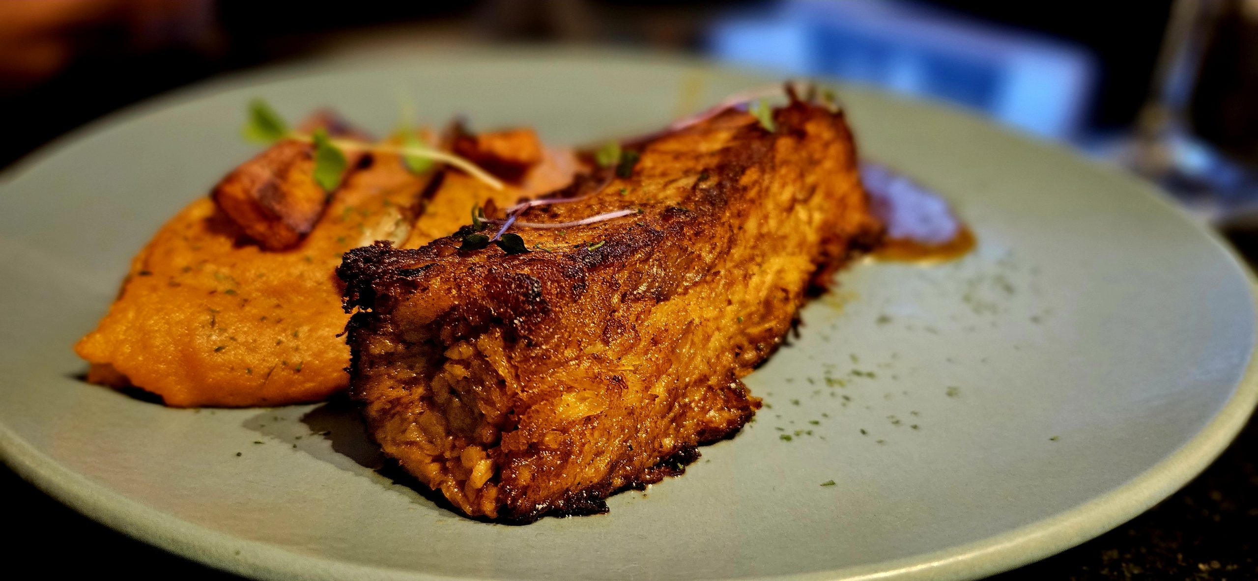 A grata surpresa é o terrine de porco, carne bem temperada e macia, e o purê de cenoura caramelizada é um escândalo de bom! Para completar a gostosura, molho de laranja e cebolinha grelhada na manteiga de garrafa.