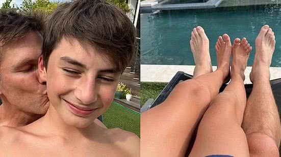 Na imagem, Tom aparece dando um beijo na bochecha do herdeiro, mostrando também as pernas dos dois perto de uma piscina, evidenciando que o garoto estava sentado em seu colo.