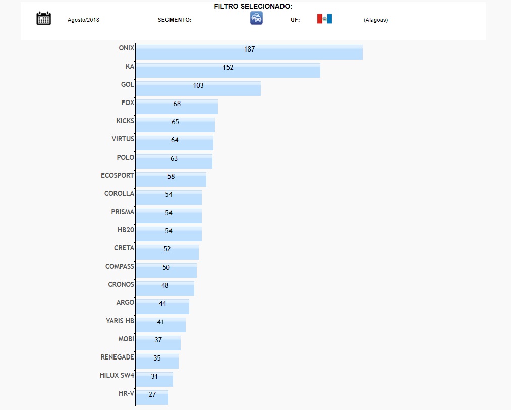 Em agosto o Chevrolet Onix voltou a liderar as vendas também em Alagoas, após perder em Julho para o VW Gol e Ford Ka, respectivamente.